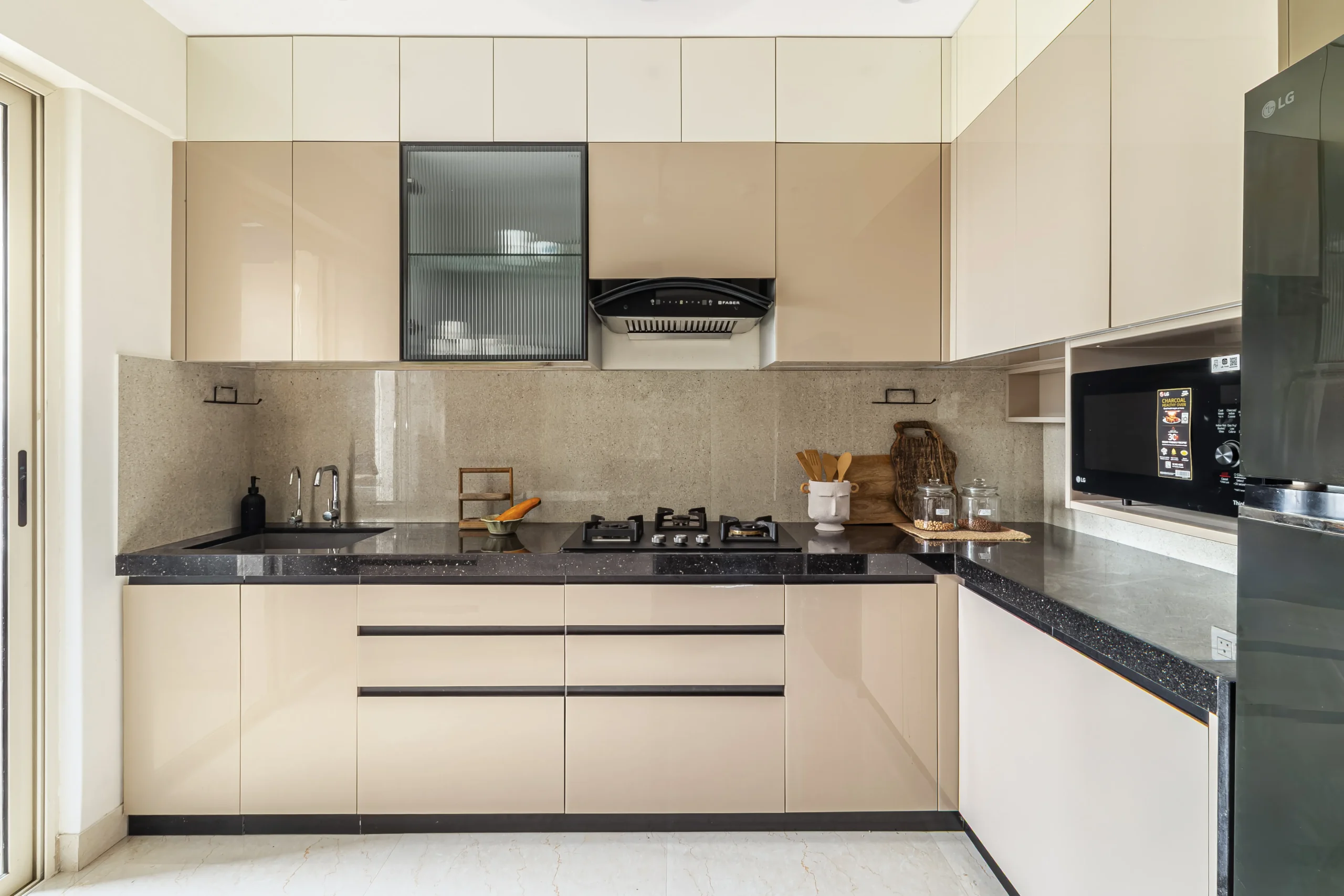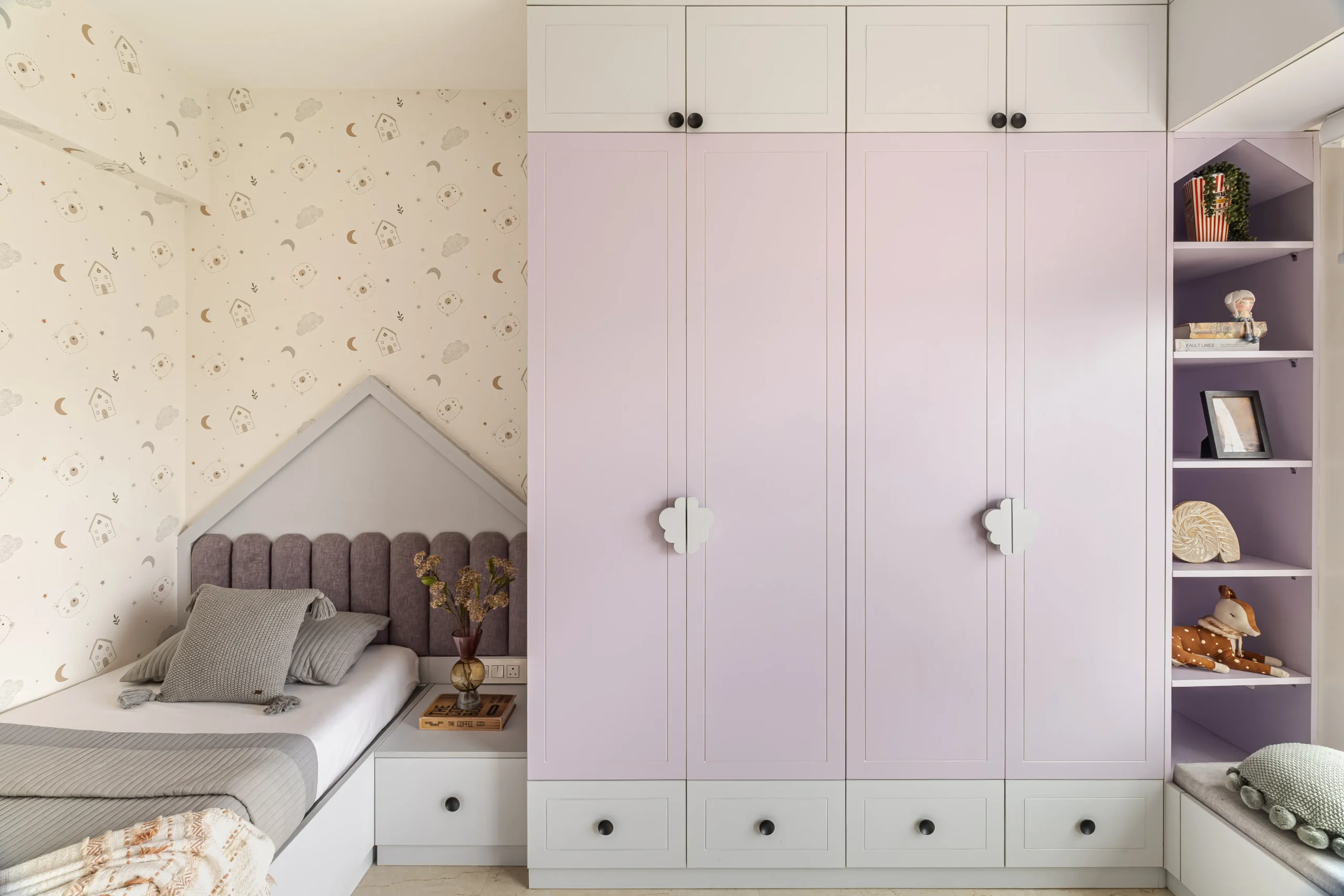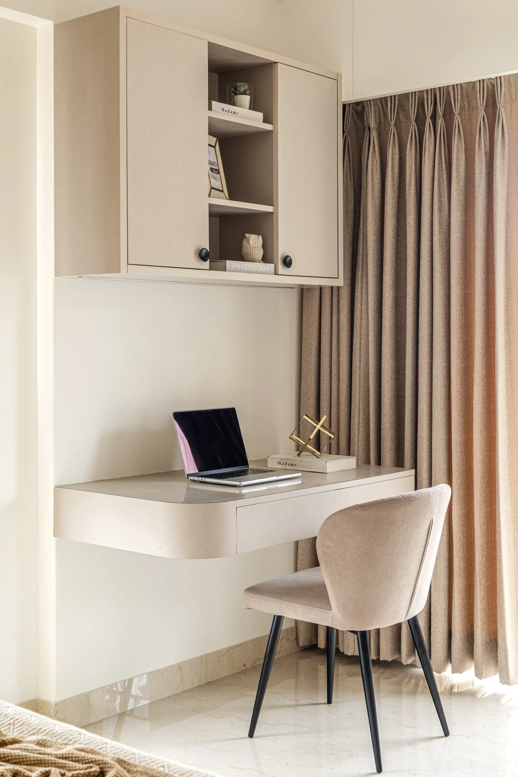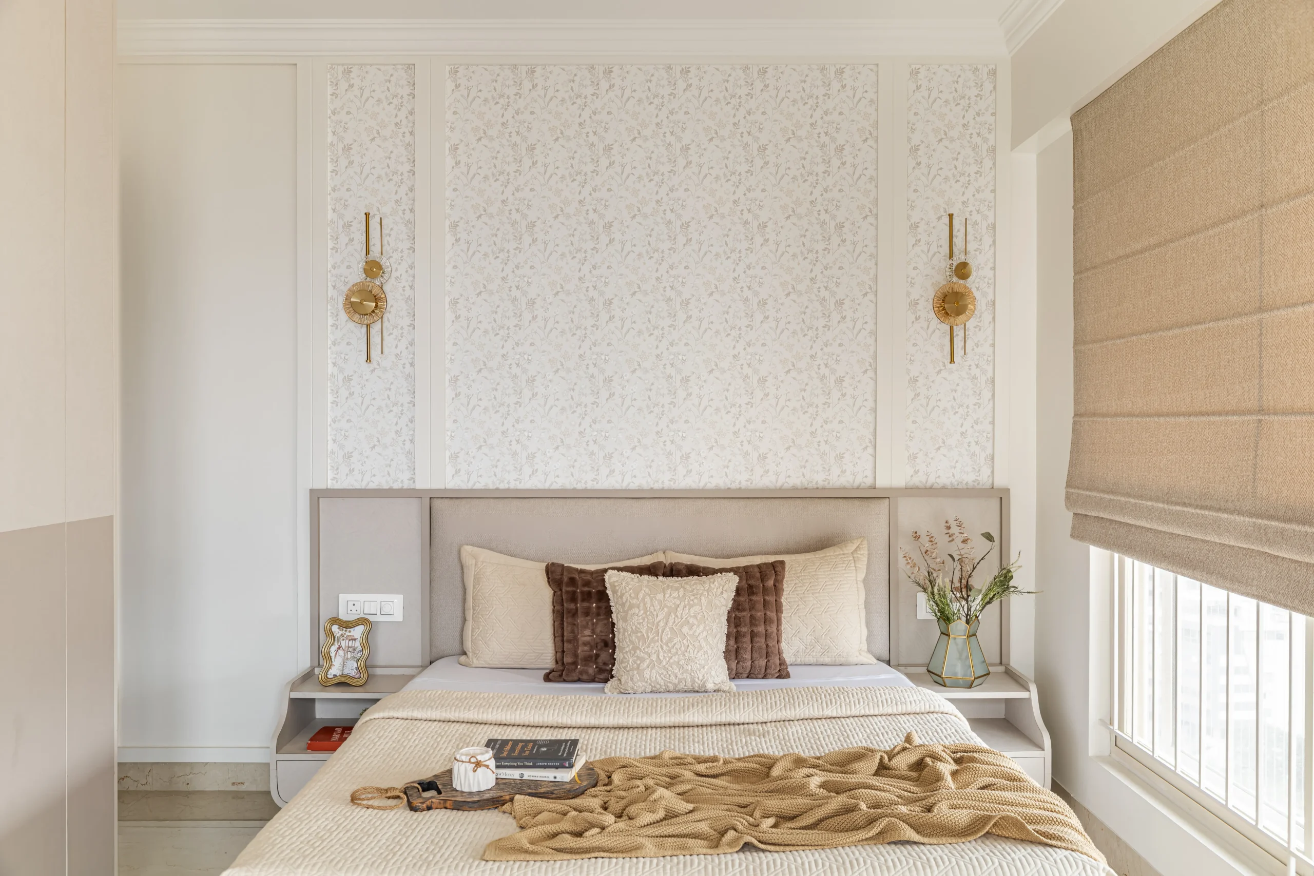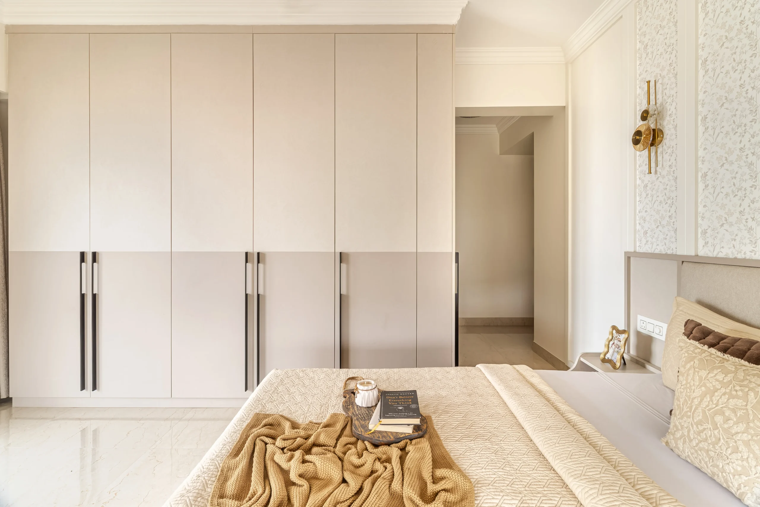 Bedroom are designed with subtle elements which are subtle in aesthetics but textured in feel. Light wallpaper, Lenin upholstery and textured laminate on wardrobe add character to the overall vibe of the room.